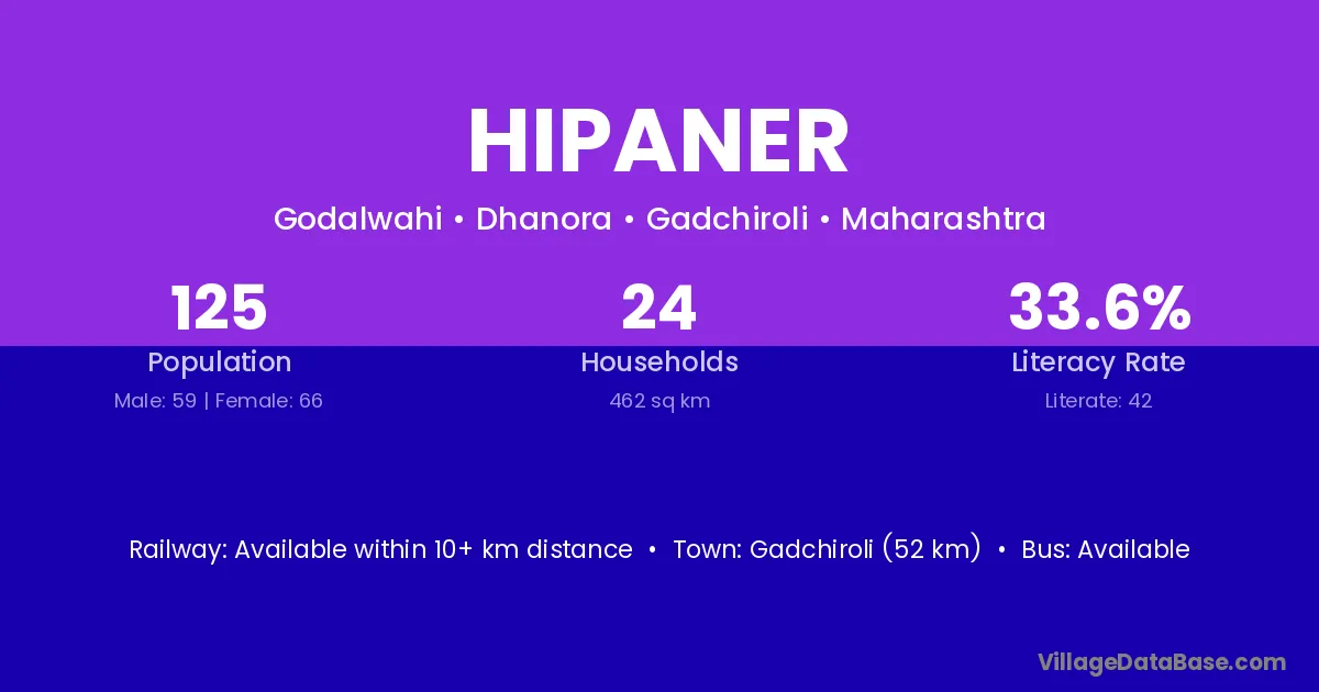 Gadchiroli (52 km) is the nearest town to Hipaner village for major economic activities and is located approximately 52 km away.