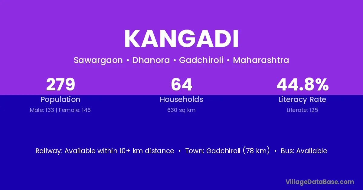 Gadchiroli (78 km) is the nearest town to Kangadi village for major economic activities and is located approximately 78 km away.