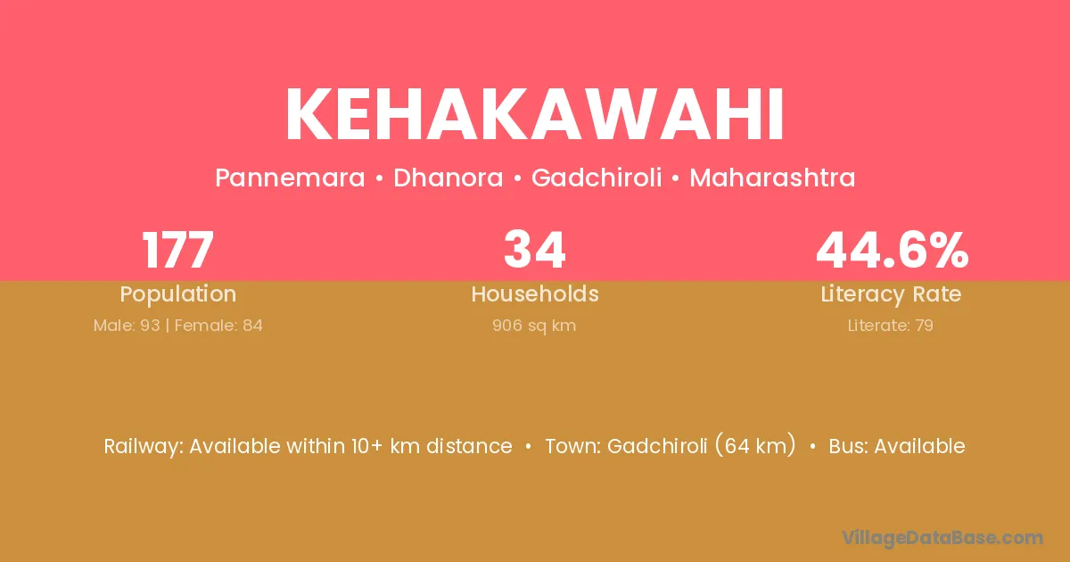 Gadchiroli (64 km) is the nearest town to Kehakawahi village for major economic activities and is located approximately 64 km away.