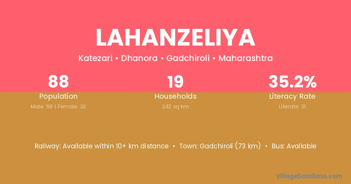 Gadchiroli (73 km) is the nearest town to Lahanzeliya village for major economic activities and is located approximately 73 km away.