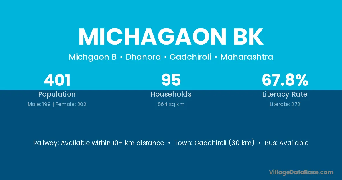 Gadchiroli (30 km) is the nearest town to Michagaon Bk village for major economic activities and is located approximately 30 km away.