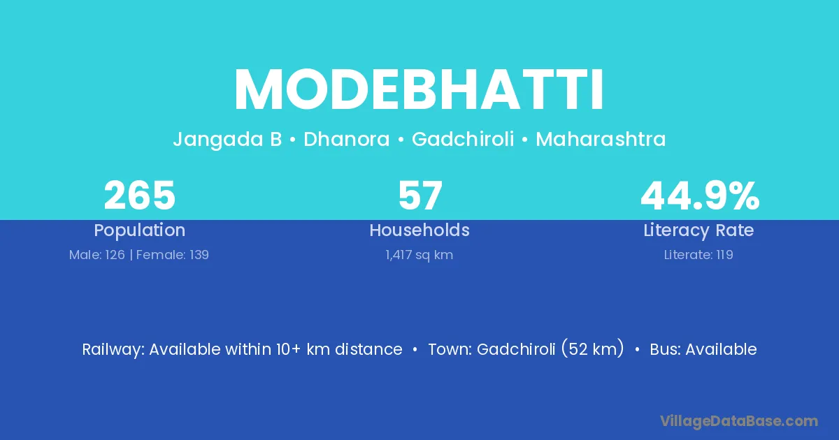 Gadchiroli (52 km) is the nearest town to Modebhatti village for major economic activities and is located approximately 52 km away.
