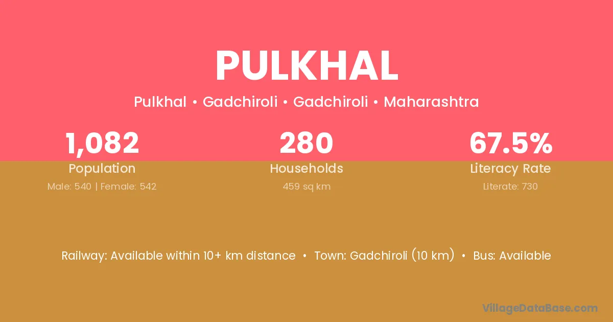 Gadchiroli (67 km) is the nearest town to Pulkhal village for major economic activities and is located approximately 67 km away.