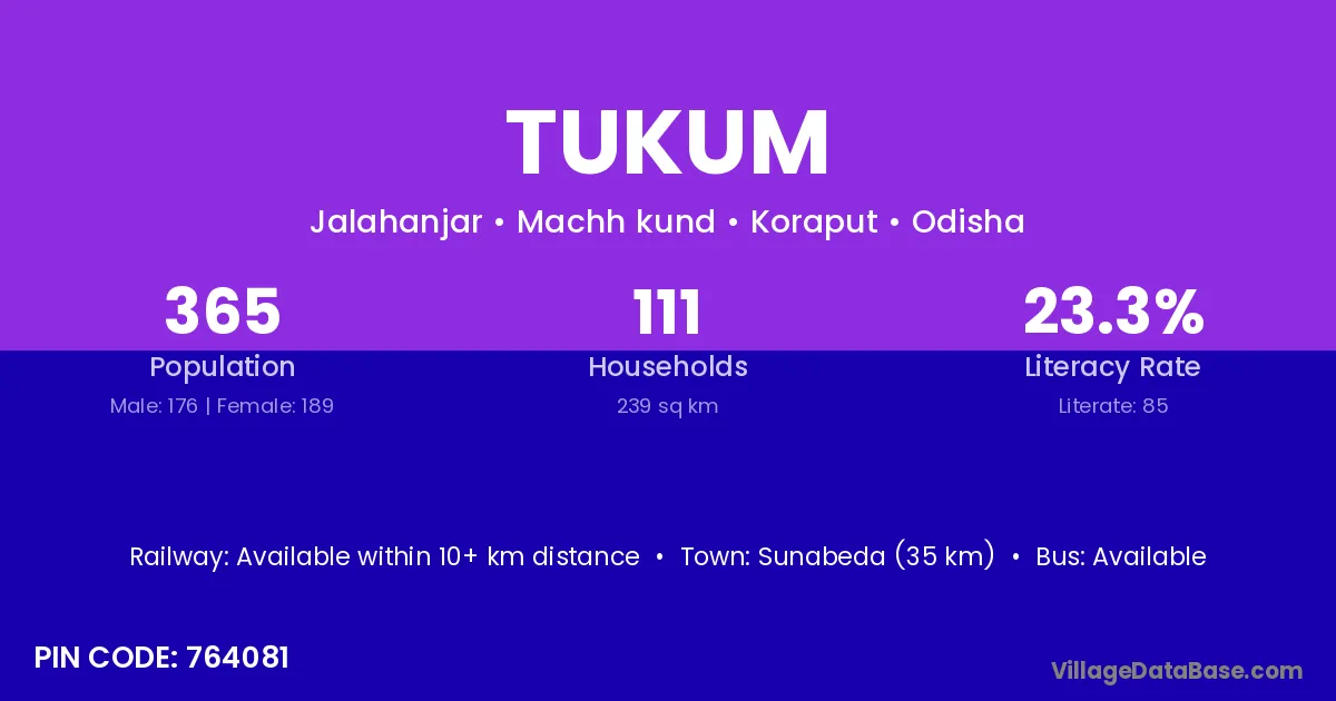 The literacy rate of Tukum village is 63.72%. Male literacy stands at 73.90% and female literacy at 52.59%.