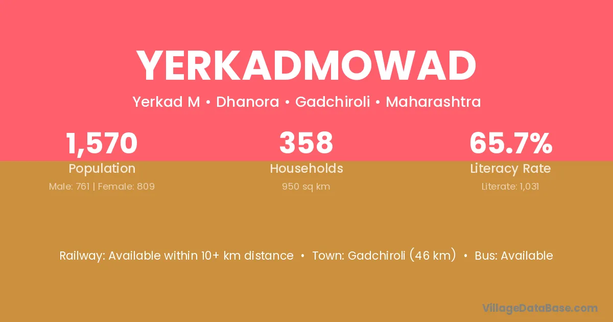 Gadchiroli (46 km) is the nearest town to Yerkadmowad village for major economic activities and is located approximately 46 km away.