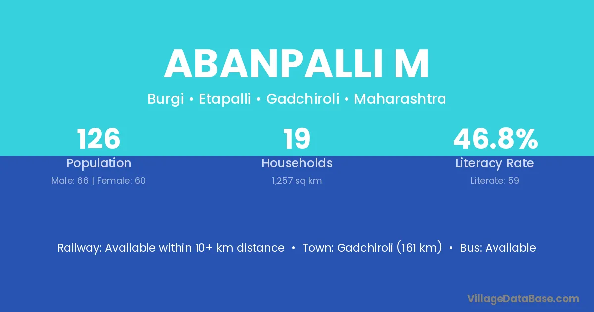 Abanpalli M village has a total population of 126 people, of which 66 are males and 60 are females.