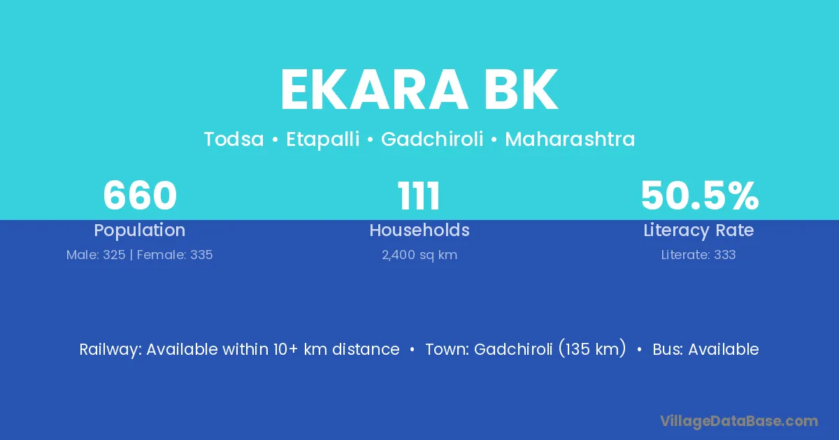 Gadchiroli (135 km) is the nearest town to Ekara Bk village for major economic activities and is located approximately 135 km away.