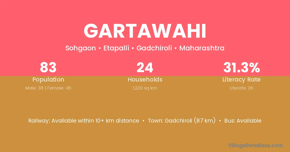 Gadchiroli (87 km) is the nearest town to Gartawahi village for major economic activities and is located approximately 87 km away.