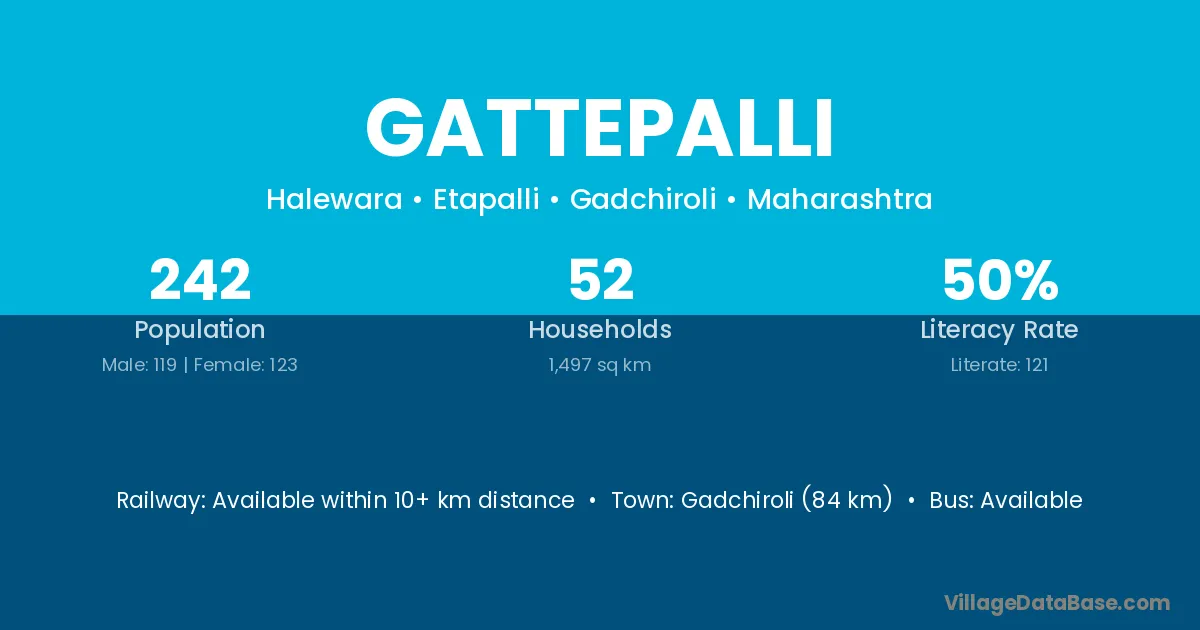 Gadchiroli (84 km) is the nearest town to Gattepalli village for major economic activities and is located approximately 84 km away.