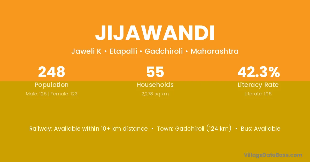 Gadchiroli (124 km) is the nearest town to Jijawandi village for major economic activities and is located approximately 124 km away.