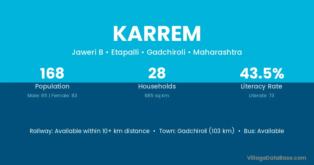 Gadchiroli (103 km) is the nearest town to Karrem village for major economic activities and is located approximately 103 km away.