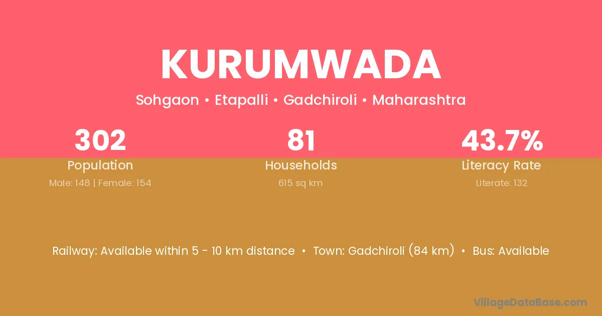 Gadchiroli (84 km) is the nearest town to Kurumwada village for major economic activities and is located approximately 84 km away.