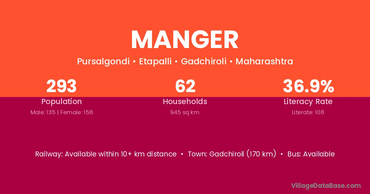 Gadchiroli (170 km) is the nearest town to Manger village for major economic activities and is located approximately 170 km away.