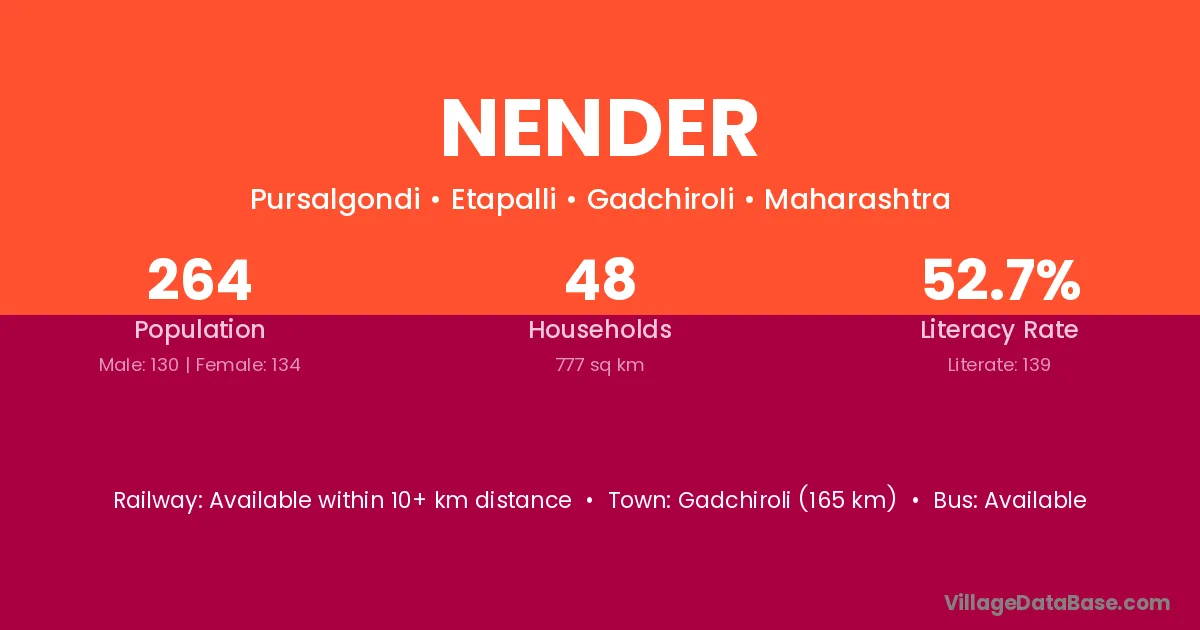 Gadchiroli (165 km) is the nearest town to Nender village for major economic activities and is located approximately 165 km away.