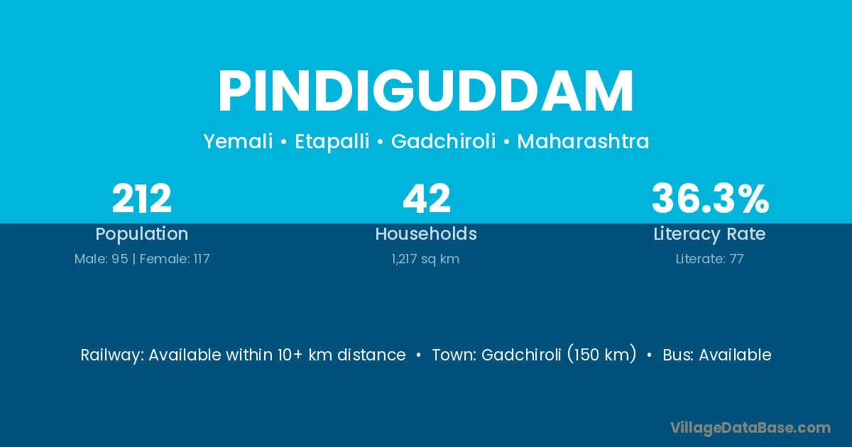 Gadchiroli (150 km) is the nearest town to Pindiguddam village for major economic activities and is located approximately 150 km away.