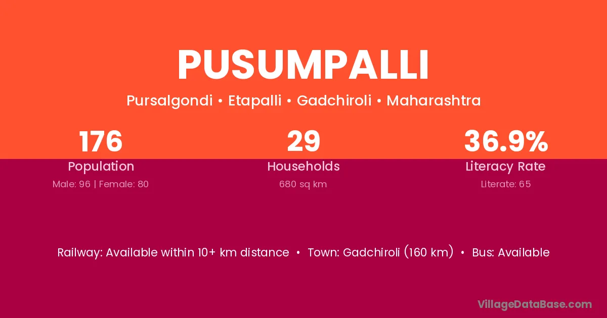 Gadchiroli (160 km) is the nearest town to Pusumpalli village for major economic activities and is located approximately 160 km away.