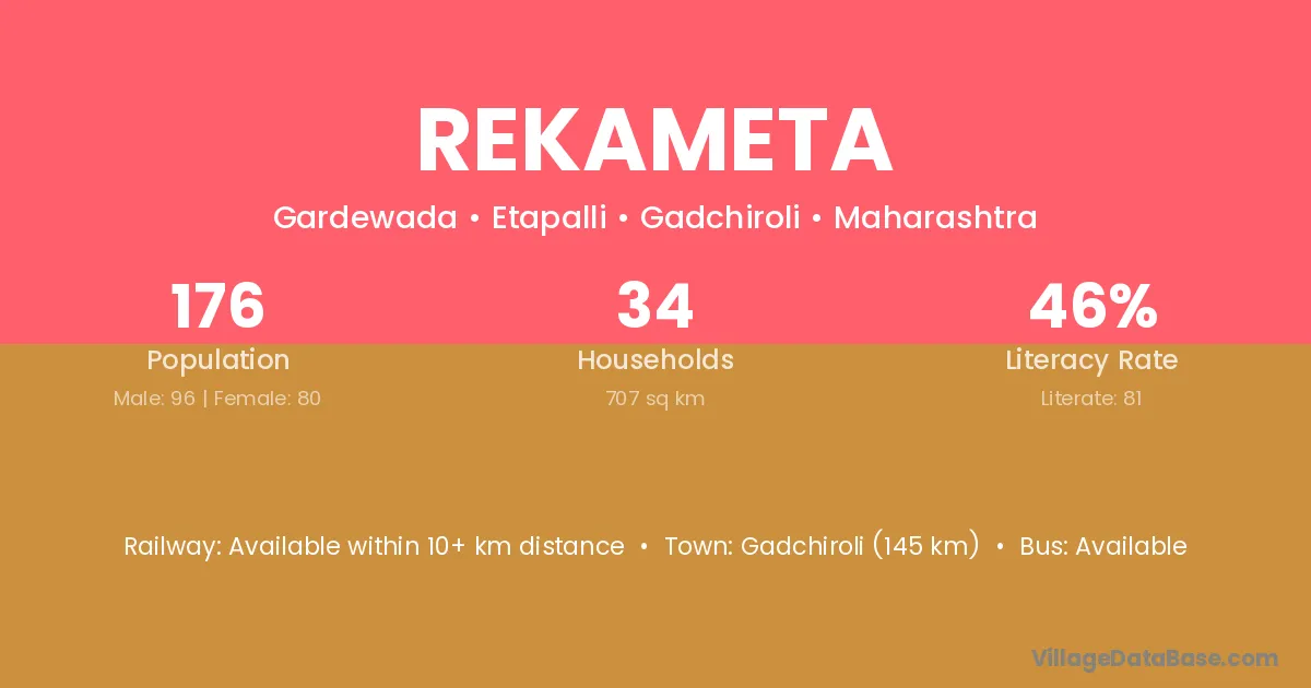 Gadchiroli (145 km) is the nearest town to Rekameta village for major economic activities and is located approximately 145 km away.