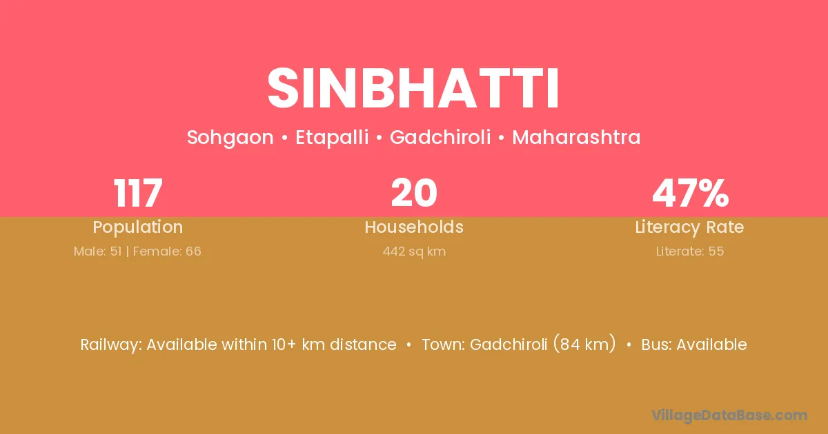 Gadchiroli (84 km) is the nearest town to Sinbhatti village for major economic activities and is located approximately 84 km away.
