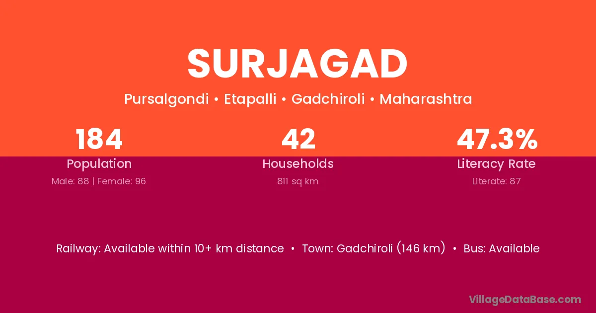 Gadchiroli (146 km) is the nearest town to Surjagad village for major economic activities and is located approximately 146 km away.