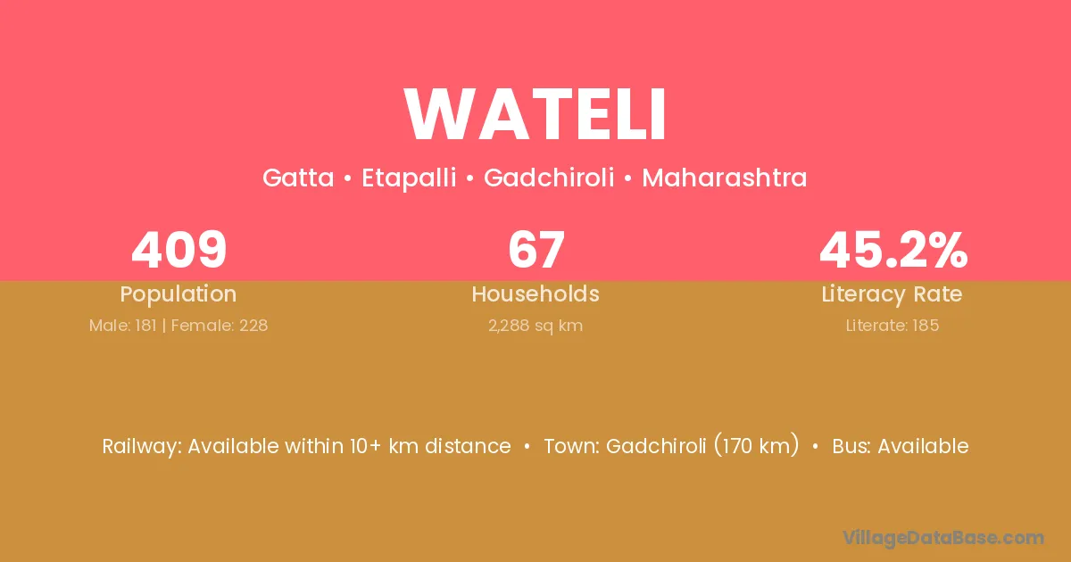 Gadchiroli (170 km) is the nearest town to Wateli village for major economic activities and is located approximately 170 km away.