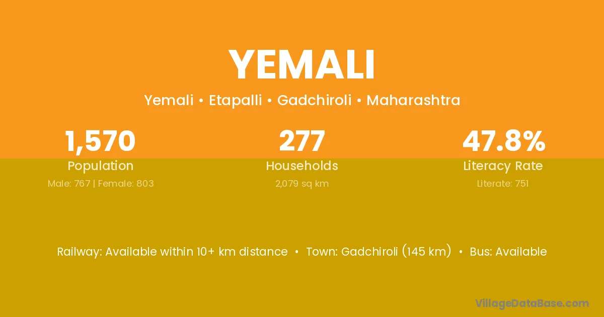 Gadchiroli (145 km) is the nearest town to Yemali village for major economic activities and is located approximately 145 km away.