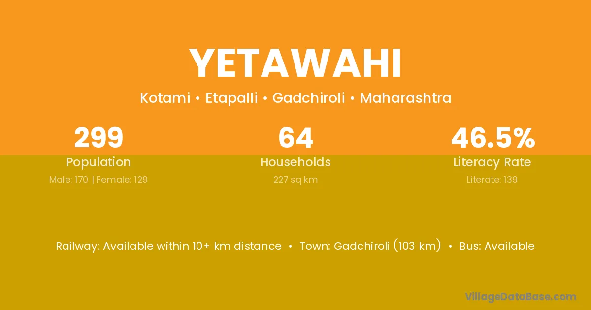 Gadchiroli (103 km) is the nearest town to Yetawahi village for major economic activities and is located approximately 103 km away.