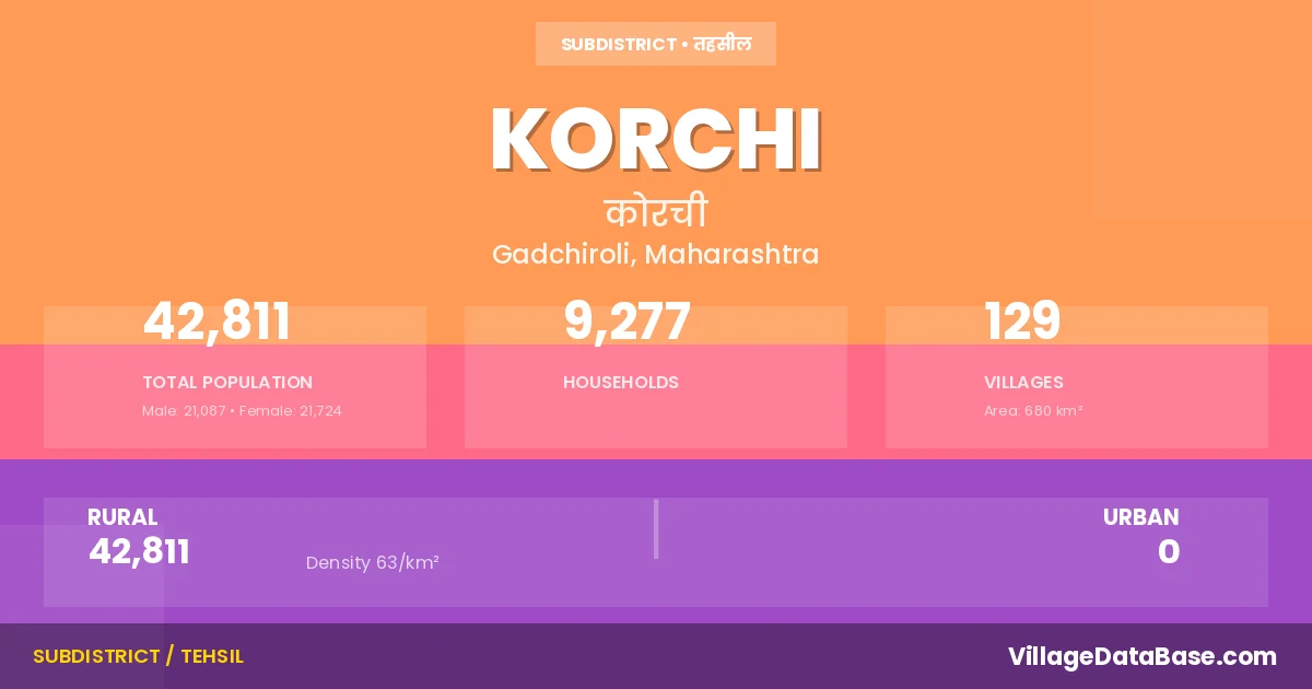 According to the 2011 census The total area of Korchi Tehsil is 680 km², with a population of 42811 people. The population density is 63 inhabitants per square kilometre, and there are approximately 9277 houses in the sub district.