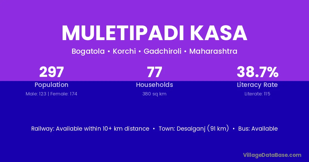 Muletipadi Kasa village has a total population of 297 people, of which 123 are males and 174 are females.