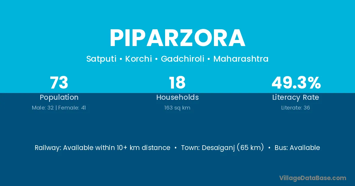 Desaiganj (65 km) is the nearest town to Piparzora village for major economic activities and is located approximately 65 km away.