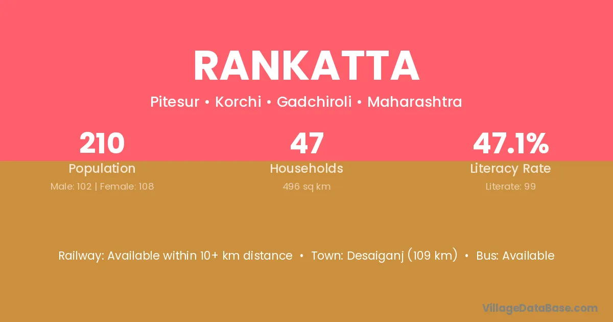 Rankatta village has a total population of 210 people, of which 102 are males and 108 are females.