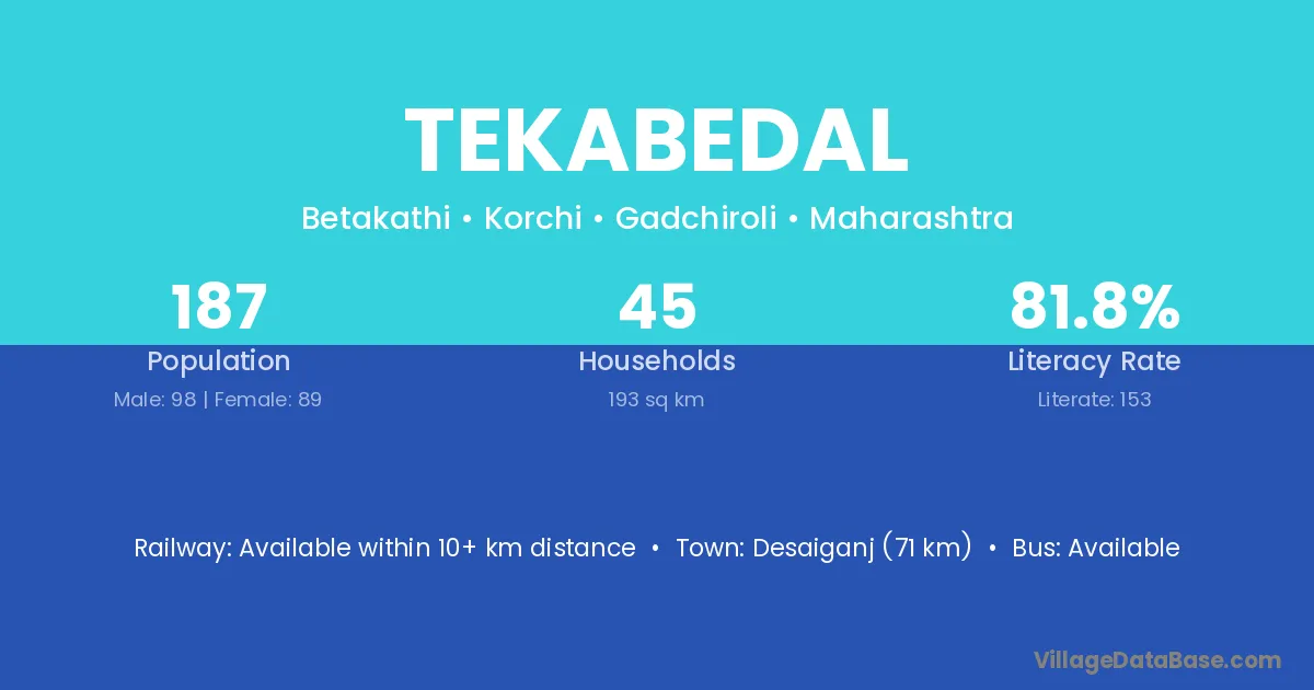 Desaiganj (71 km) is the nearest town to Tekabedal village for major economic activities and is located approximately 71 km away.