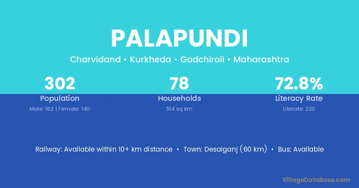 Palapundi village has a total population of 302 people, of which 162 are males and 140 are females.