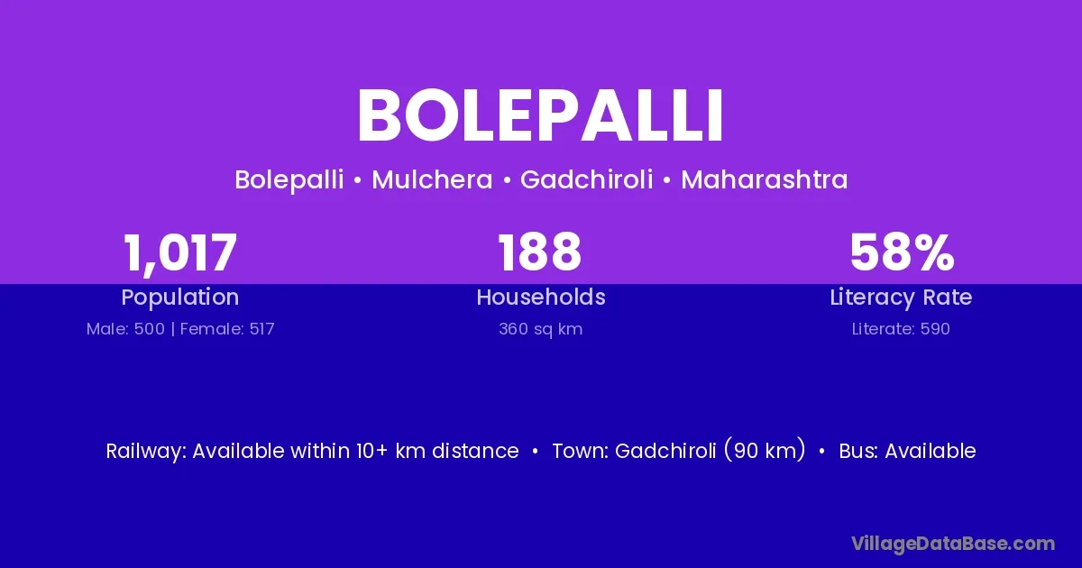 Gadchiroli (90 km) is the nearest town to Bolepalli village for major economic activities and is located approximately 90 km away.