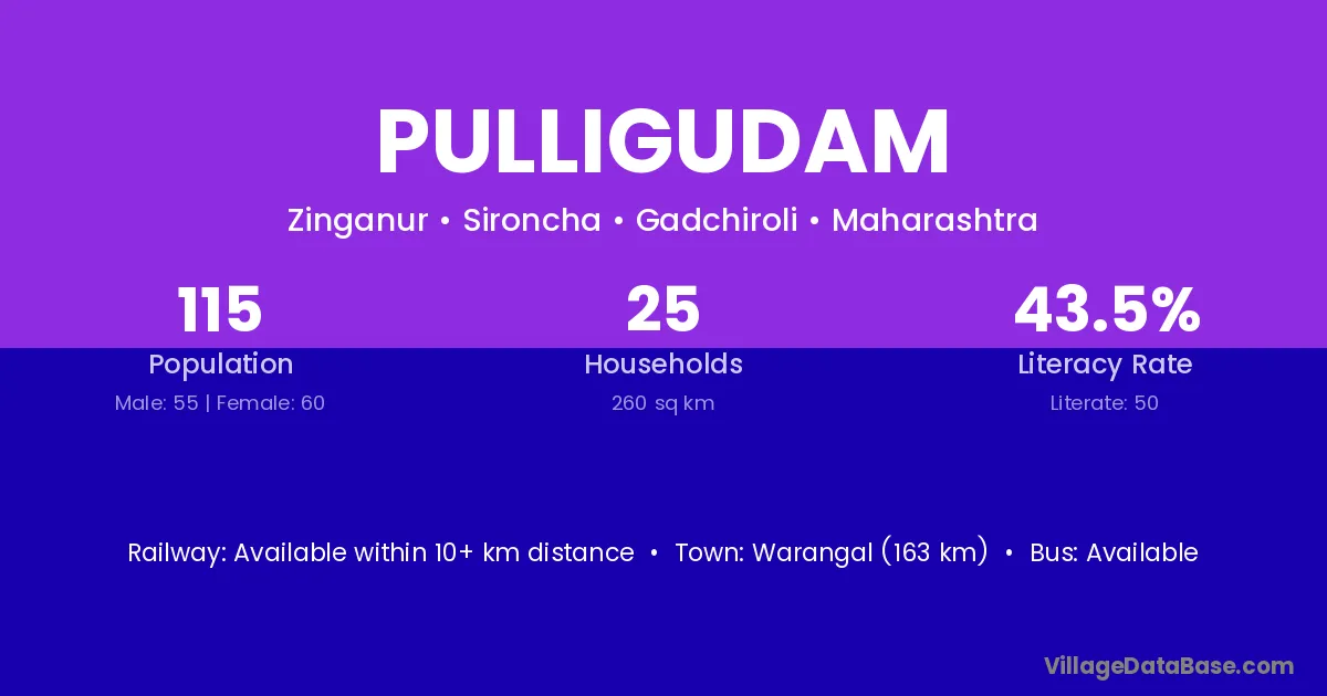 Gadchiroli (110 km) is the nearest town to Pulligudam village for major economic activities and is located approximately 110 km away.