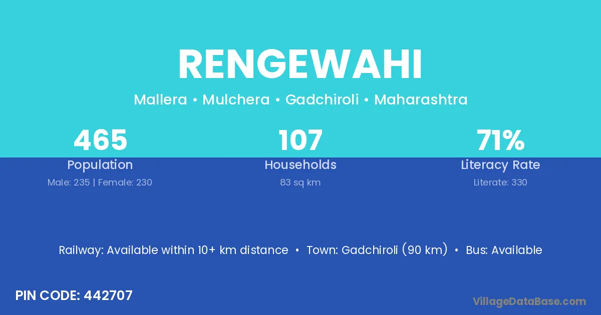 Gadchiroli (90 km) is the nearest town to Rengewahi village for major economic activities and is located approximately 90 km away.