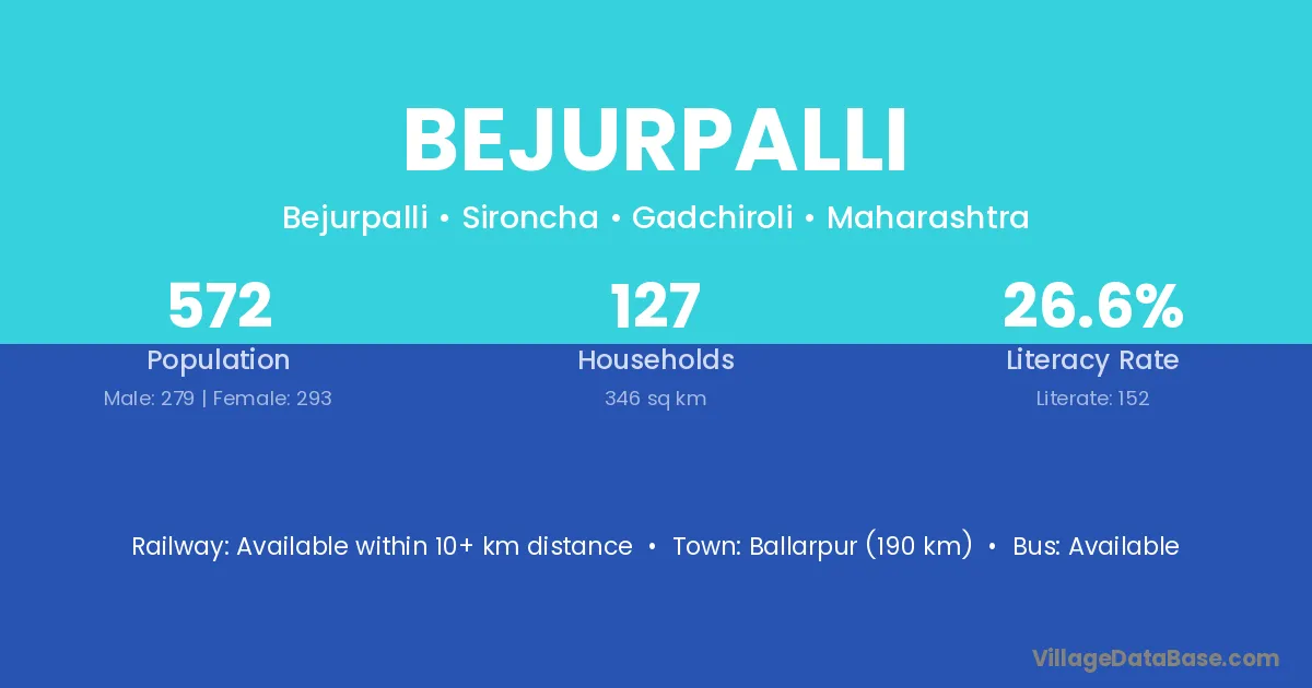 Ballarpur (190 km) is the nearest town to Bejurpalli village for major economic activities and is located approximately 190 km away.