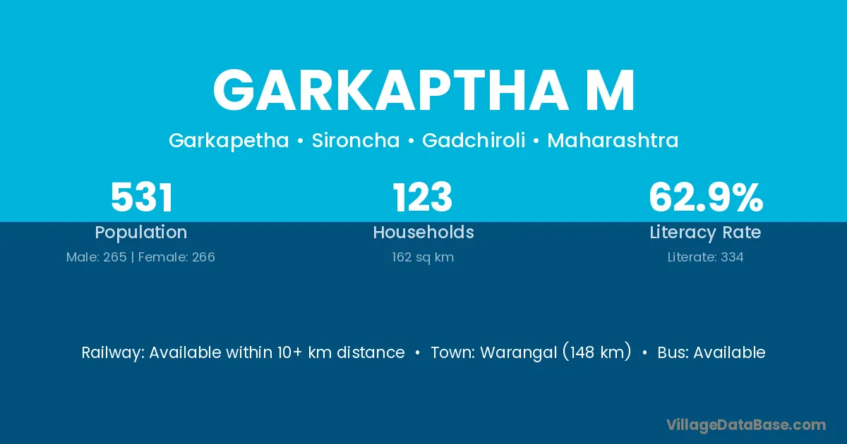Warangal (148 km) is the nearest town to Garkaptha M village for major economic activities and is located approximately 148 km away.