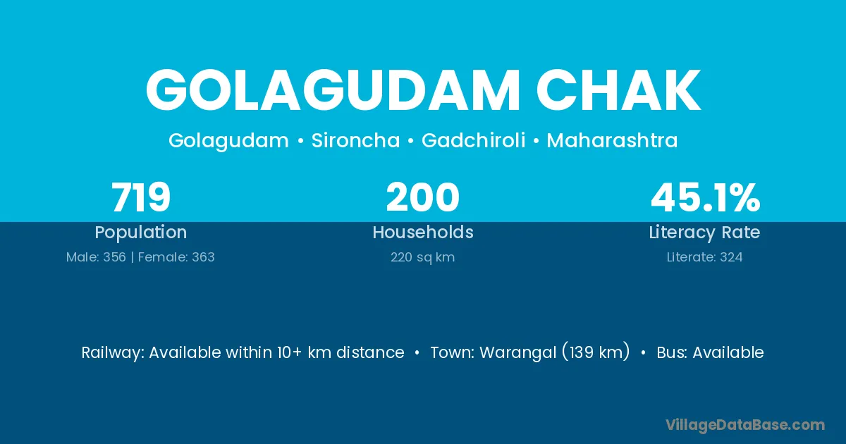 Warangal (139 km) is the nearest town to Golagudam Chak village for major economic activities and is located approximately 139 km away.