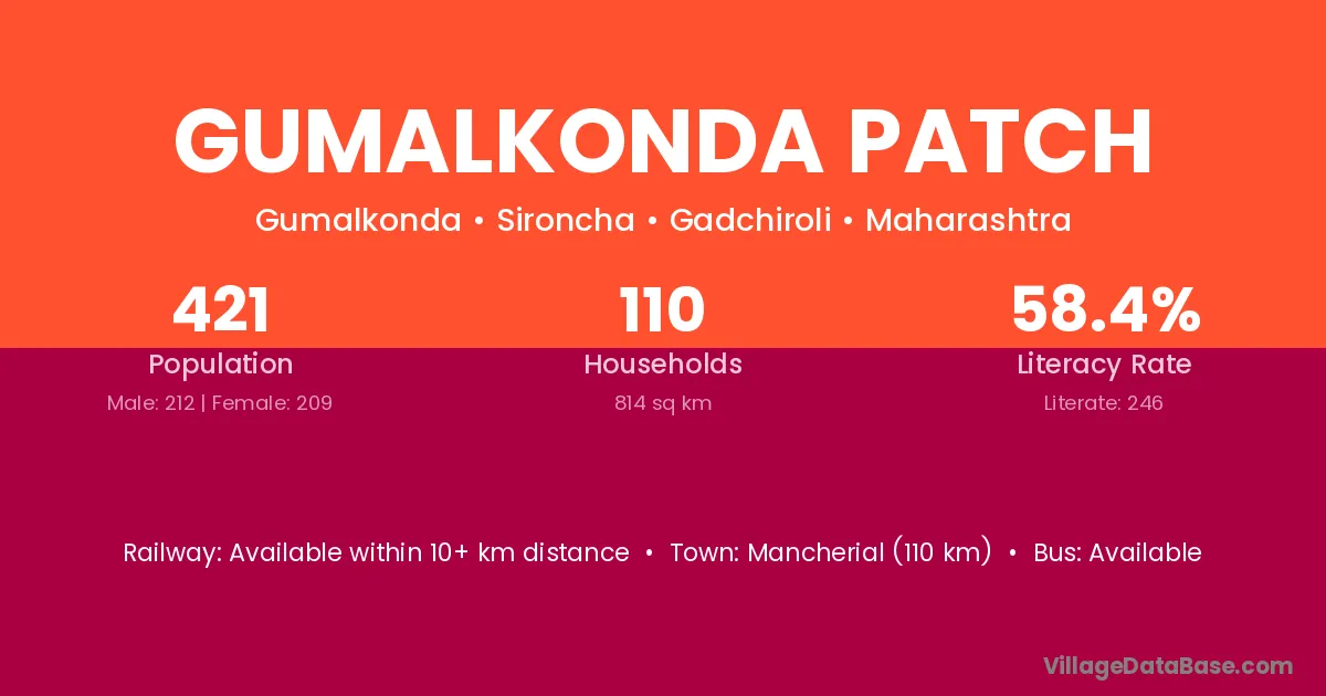 Gumalkonda Patch village has a total population of 421 people, of which 212 are males and 209 are females.