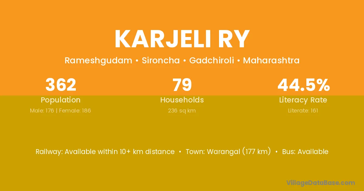 Warangal (177 km) is the nearest town to Karjeli Ry village for major economic activities and is located approximately 177 km away.