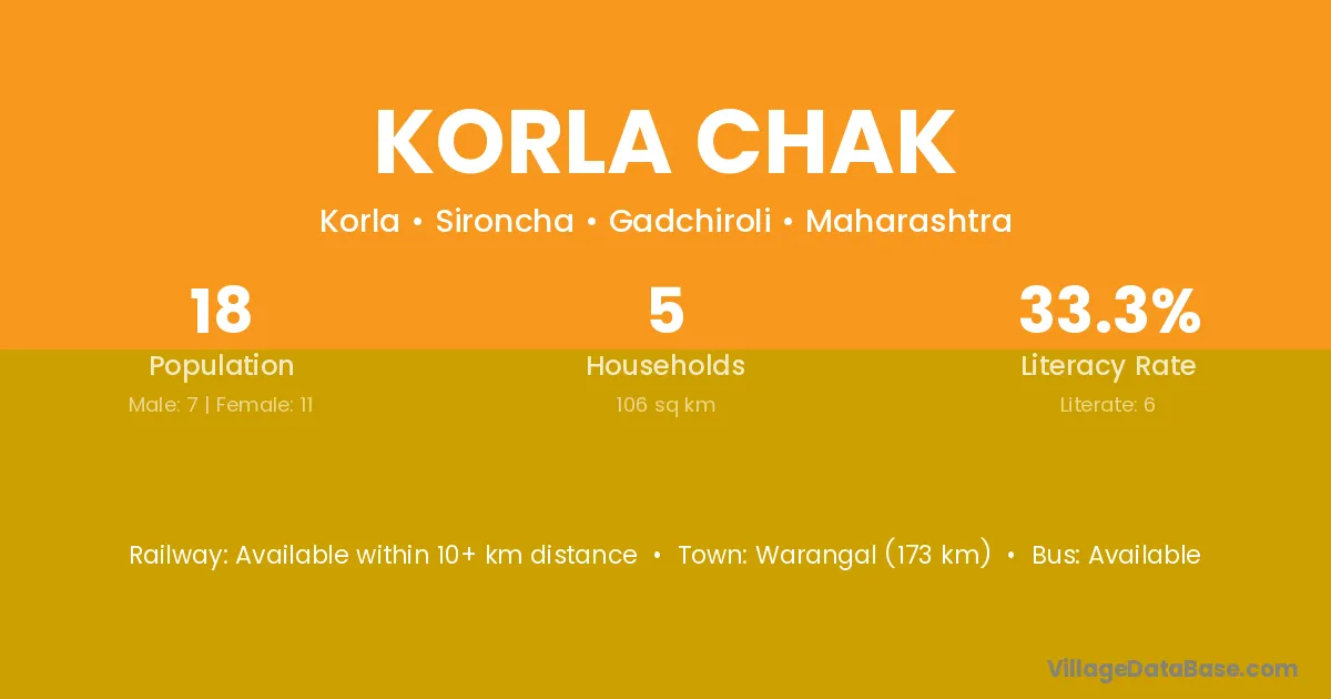 Warangal (173 km) is the nearest town to Korla Chak village for major economic activities and is located approximately 173 km away.