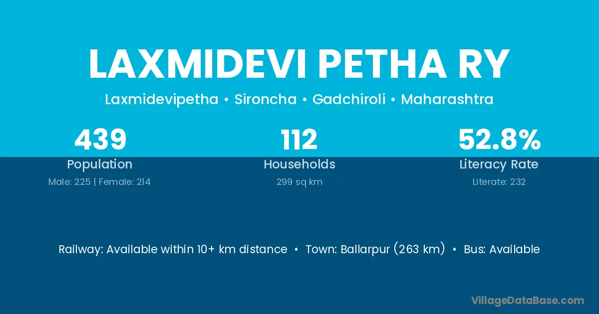 Laxmidevi Petha Ry village has a total population of 439 people, of which 225 are males and 214 are females.
