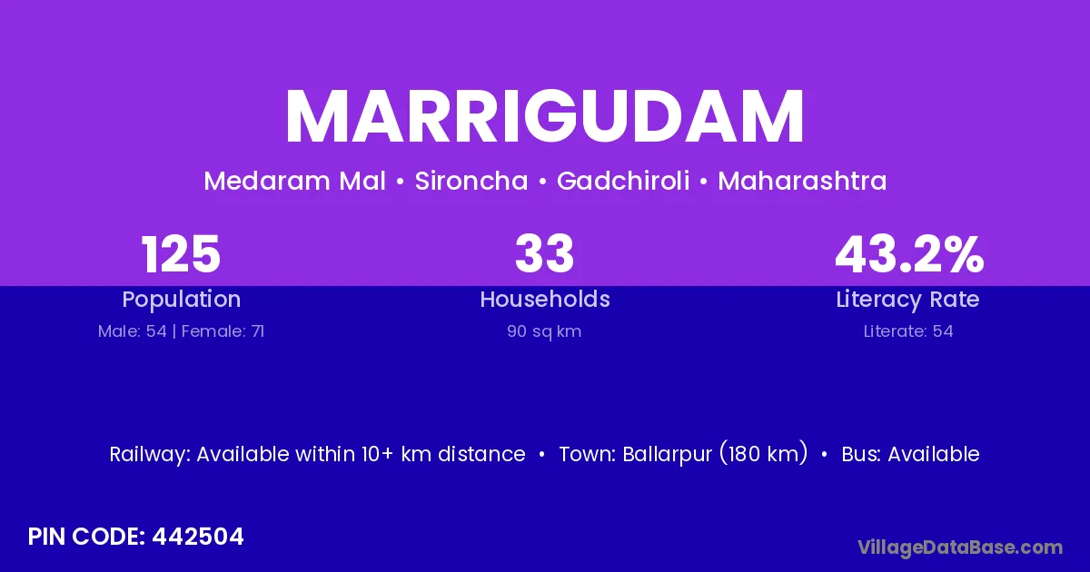 Ballarpur (180 km) is the nearest town to Marrigudam village for major economic activities and is located approximately 180 km away.