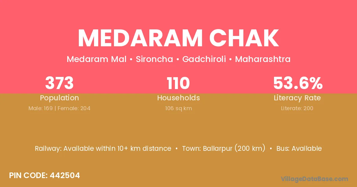 Ballarpur (200 km) is the nearest town to Medaram Chak village for major economic activities and is located approximately 200 km away.