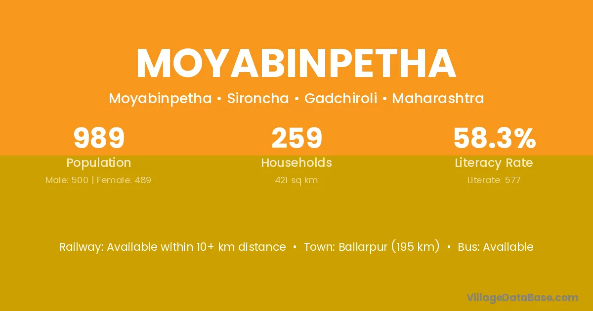 Moyabinpetha village has a total population of 989 people, of which 500 are males and 489 are females.