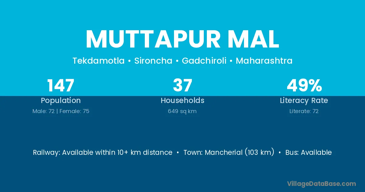 Mancherial (103 km) is the nearest town to Muttapur Mal village for major economic activities and is located approximately 103 km away.