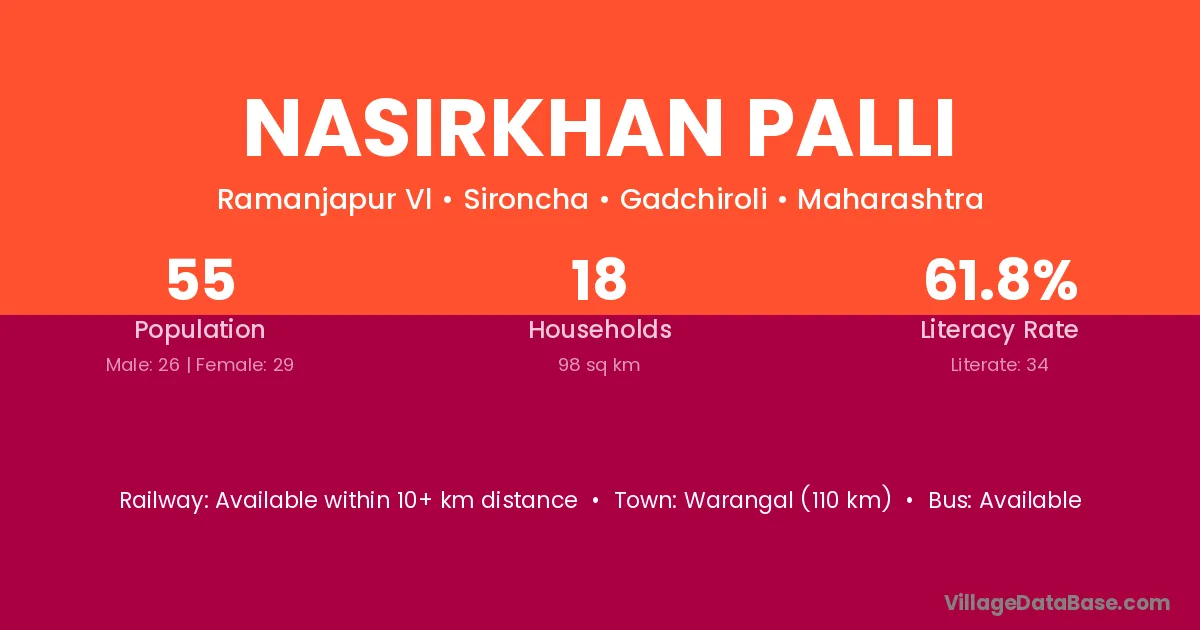 Warangal (110 km) is the nearest town to Nasirkhan Palli village for major economic activities and is located approximately 110 km away.