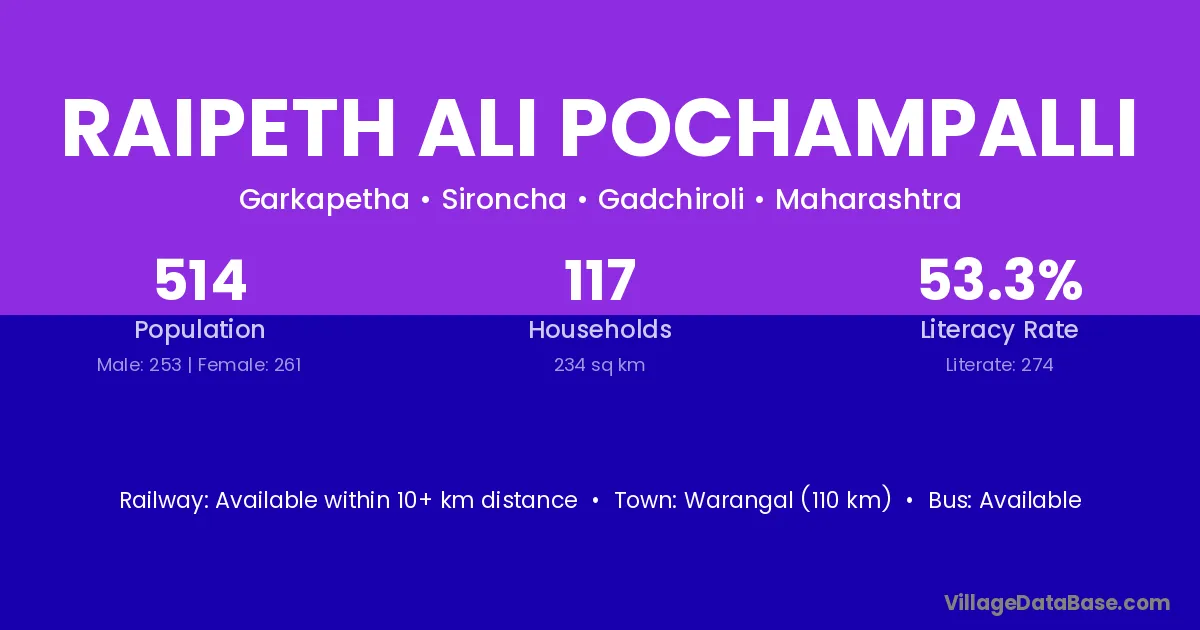 Raipeth Ali Pochampalli village has a total population of 514 people, of which 253 are males and 261 are females.