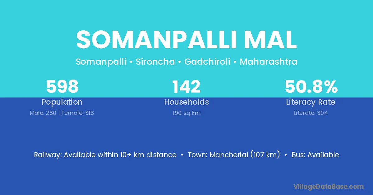 Somanpalli Mal village has a total population of 598 people, of which 280 are males and 318 are females.
