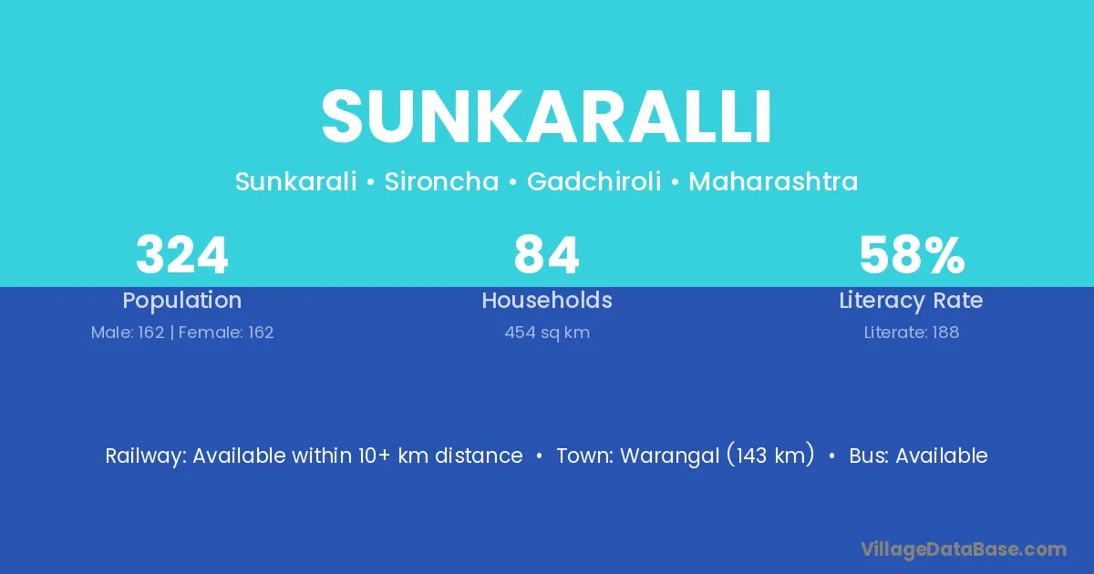 Warangal (143 km) is the nearest town to Sunkaralli village for major economic activities and is located approximately 143 km away.